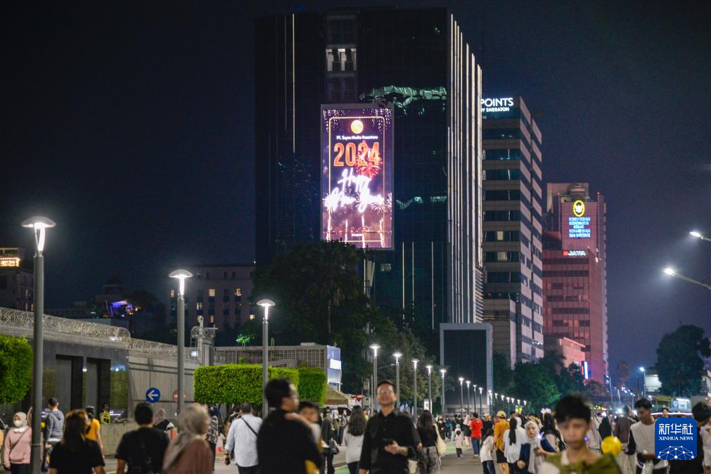 2023年12月31日晚,在印度尼西亞雅加達蘇迪曼大街,人們觀看迎新年演出。