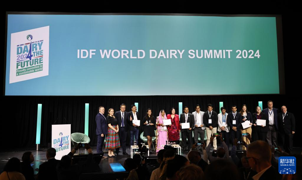 中國企業獲得國際乳品聯合會創新獎 10月18日,獲獎代表在法國巴黎舉辦的2024世界乳業峰會頒獎儀式上合影留念。 國際乳品聯合會18日在巴黎舉辦的2024世界乳業峰會上宣布,來自中國的伊利集團獲得一項國際乳品聯合會創新獎。 新華社記者 高靜 攝