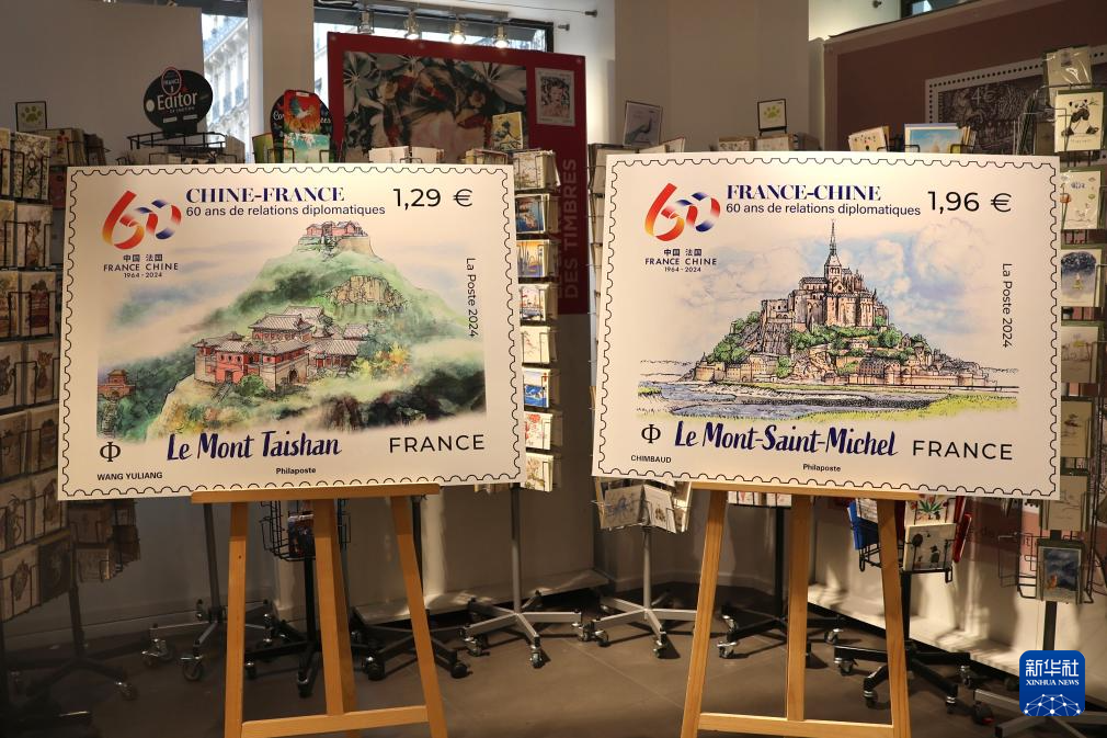 《中法建交六十周年》紀念郵票在法國發行 這是10月18日在法國巴黎舉行的《中法建交六十周年》紀念郵票首發儀式現場拍攝的郵票圖案展示。 為慶祝中法建交60周年暨中法文化旅游年,由中法兩國聯合發行的《中法建交六十周年》紀念郵票首發儀式18日在巴黎舉行。 新華社記者 張百慧 攝